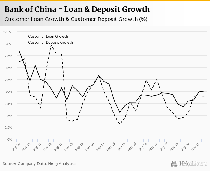 Bank of China's customer loan growth reached 10.1% in 2019-06-30, up from 6.80% compared to the previous year. Historically, the bank’s loans growth reached an all time high of 18.3% in 2010-09-30 and an all time low of 5.61% in 2015-06-30. In the last decade, the average annual loan growth amounted to 0%.