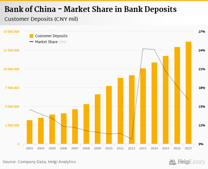 Bank of China accounted for 16.1% of all customer deposits taken by banks in China at the end of 2017. Historically, the bank’s market share in customer deposits reached an all time high of 24.2% in 2013 and an all time low of 9.66% in 2018.