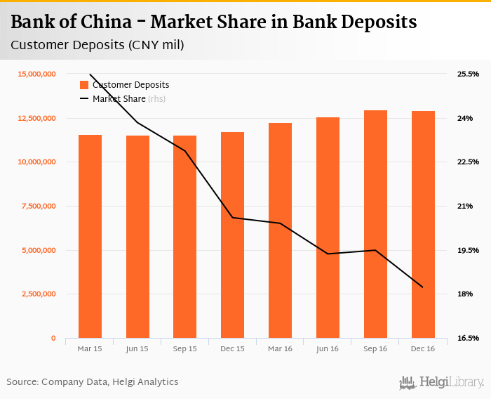 Bank of China accounted for 18.2% of all customer deposits taken by banks in China at the end of 2016-12-31. Historically, the bank’s market share in customer deposits reached an all time high of 25.5% in 2015-03-31 and an all time low of 18.2% in 2016-12-31.