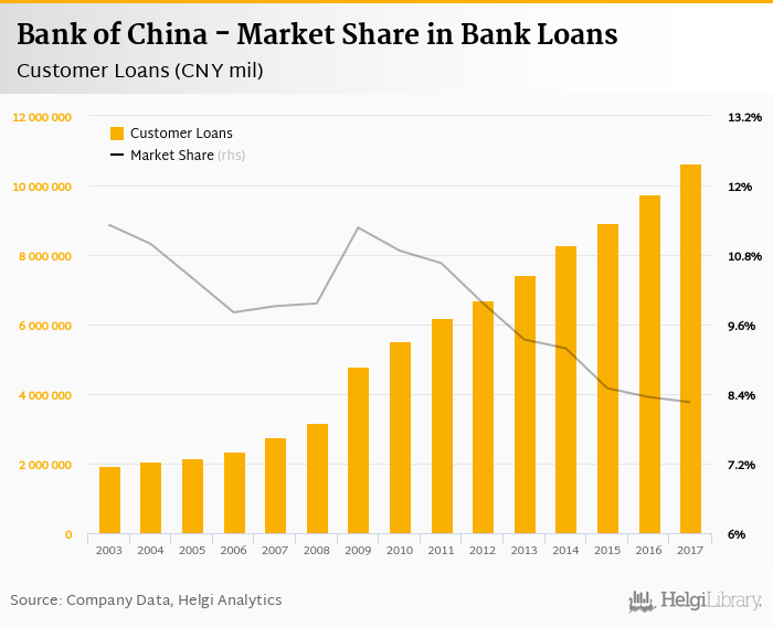 Bank of China accounted for 8.26% of all customer loans issued in China at the end of 2017. Historically, the bank’s market share in customer loans reached an all time high of 11.3% in 2003 and an all time low of 7.94% in 2018.
