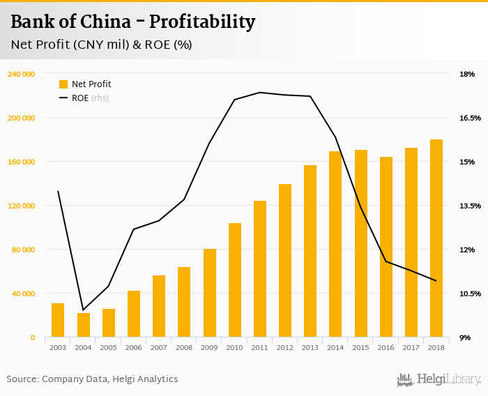 Bank of China made a net profit of CNY 180,086 mil in 2018, up 4.45% compared to the previous year. This implies a return on equity of 10.9%.