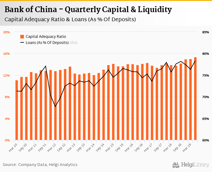 Bank of China's capital adequacy ratio reached 15.3% at the end of second quarter of 2019, up from 15.0% when compared to the previous quarter. Historically, the bank’s capital ratio hit an all time high of 15.3% in 2Q2019 and an all time low of 11.1% in 1Q2010.