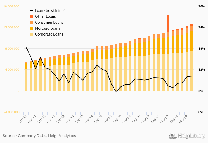 Mortgage loans represented 29.9% of the bank's loan book at the end of the year 2Q2019, consumer further 7.94% and corporate loans 59.7% of total loans.