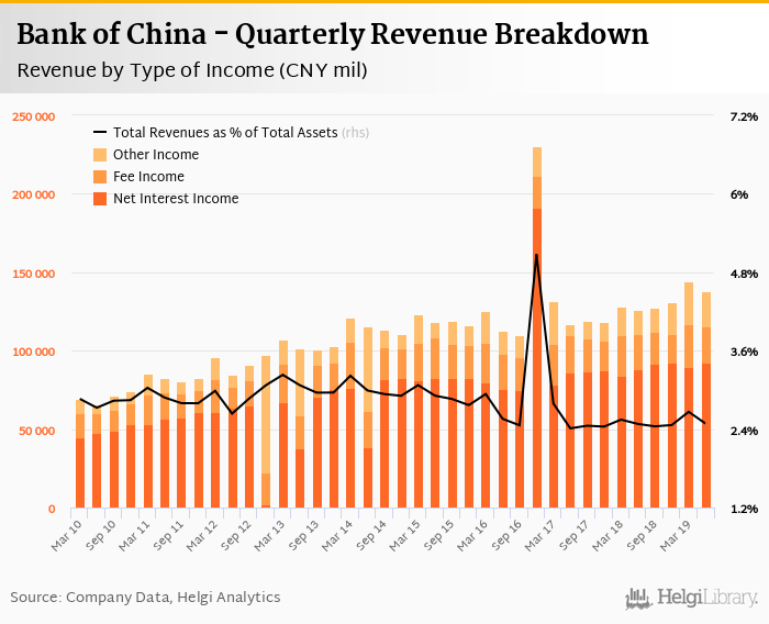 Bank of China generated total banking revenues of CNY 138,264 mil in the second quarter of 2019, up 9.94% when compared to the same period of last year and down 3.97% when compared to the previous quarter.