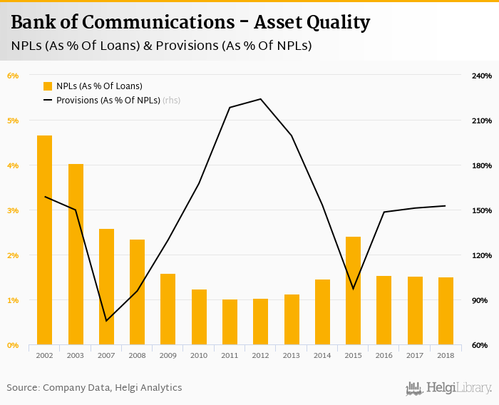 Bank of Communications's non-performing loans reached 1.51% of total loans at the end of 2018, down from 1.52% compared to the previous year. Historically, the NPL ratio hit an all time high of 4.67% in 2002 and an all time low of 1.01% in 2011.
