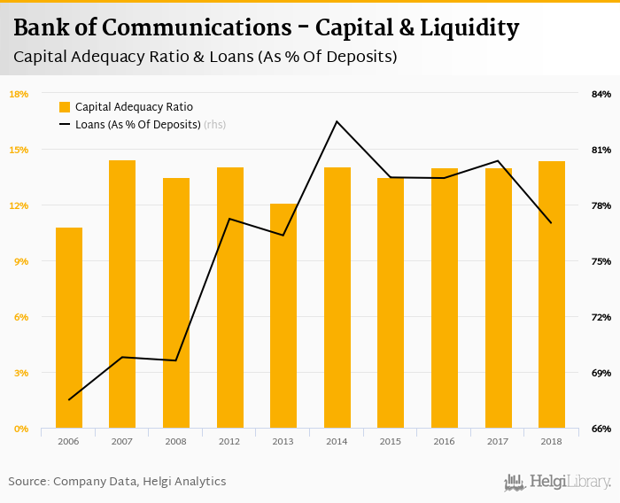 Bank of Communications's capital adequacy ratio reached 14.4% at the end of 2018, up from 14.0% compared to the previous year. Historically, the bank’s capital ratio hit an all time high of 14.4% in 2007 and an all time low of 10.8% in 2006.