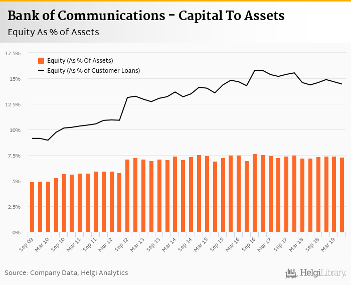 Bank of Communications's Equity reached 4.91% of total assets in the 2Q2019, up from 4.86% for the previous year. As a share of net customer loans, the ratio amounted to 10.9% at the end of the second quarter of 2019.