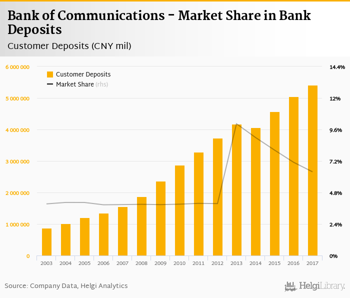 Bank of Communications accounted for 6.38% of all customer deposits taken by banks in China at the end of 2017. Historically, the bank’s market share in customer deposits reached an all time high of 10.0% in 2013 and an all time low of 3.86% in 2006.