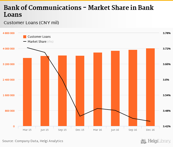 Bank of Communications accounted for 3.44% of all customer loans issued in China at the end of 2016-12-31. Historically, the bank’s market share in customer loans reached an all time high of 3.72% in 2015-03-31 and an all time low of 3.44% in 2016-12-31.