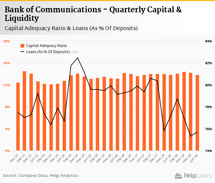Bank of Communications's capital adequacy ratio reached 13.8% at the end of second quarter of 2019, down from 14.2% when compared to the previous quarter. Historically, the bank’s capital ratio hit an all time high of 14.5% in 3Q2012 and an all time low of 12.1% in 4Q2013.