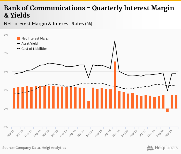Bank of Communications's net interest margin amounted to 1.43% in the second quarter of 2019, down from 1.44% when compared to the previous quarter.