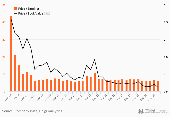 In terms of price to book value, the stock reached 0.608x at the end of 2Q2019. Since the second quarter of 2014, the multiple reached an all time high of 1.42x in 2Q2015 and an all time low of 0.608x in 2Q2019 with an average of 0.825x.