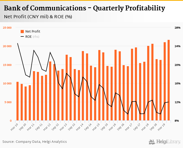 Bank of Communications made a net profit of CNY 21,678 mil in the second quarter of 2019, up 4.83% when compared to the same period of last year. This implies a return on equity of 12.0%.