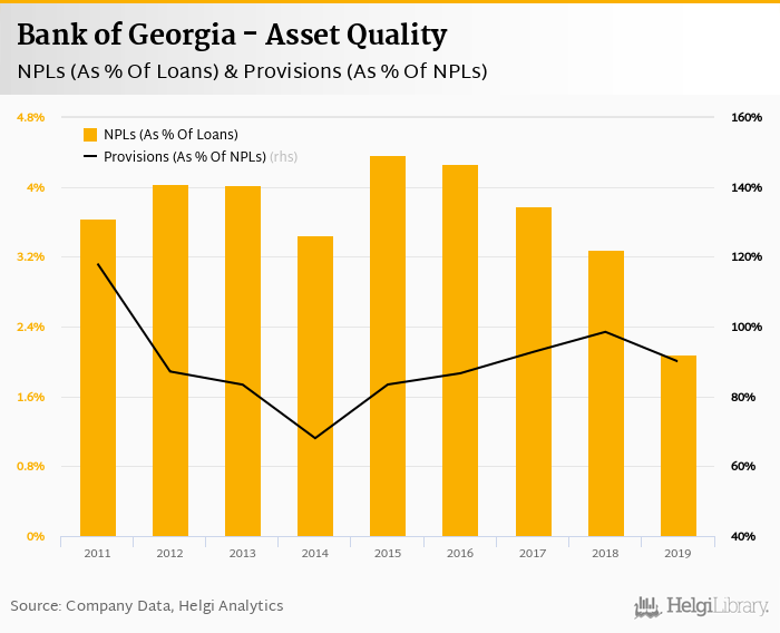 Bank of Georgia's non-performing loans reached 2.08% of total loans at the end of 2019, down from 3.28% compared to the previous year. Historically, the NPL ratio hit an all time high of 4.37% in 2015 and an all time low of 2.08% in 2019.