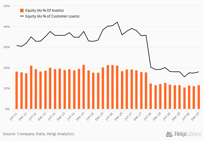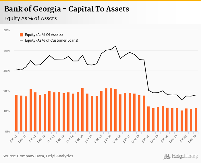 Bank of Georgia's Equity reached 11.6% of total assets in the 4Q2020, down from 11.6% for the previous year. As a share of net customer loans, the ratio amounted to 18.0% at the end of the fourth quarter of 2020.