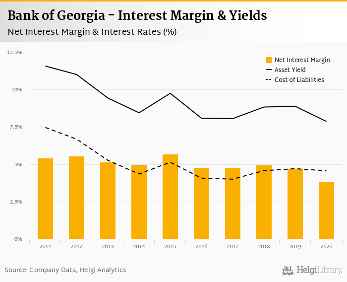 Bank of Georgia's net interest margin amounted to 3.83% in 2020, down from 4.73% compared to the previous year.