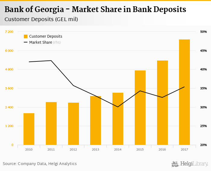 Bank of Georgia accounted for 35.4% of all customer deposits taken by banks in Georgia at the end of 2017. Historically, the bank’s market share in customer deposits reached an all time high of 42.3% in 2011 and an all time low of 30.0% in 2014.