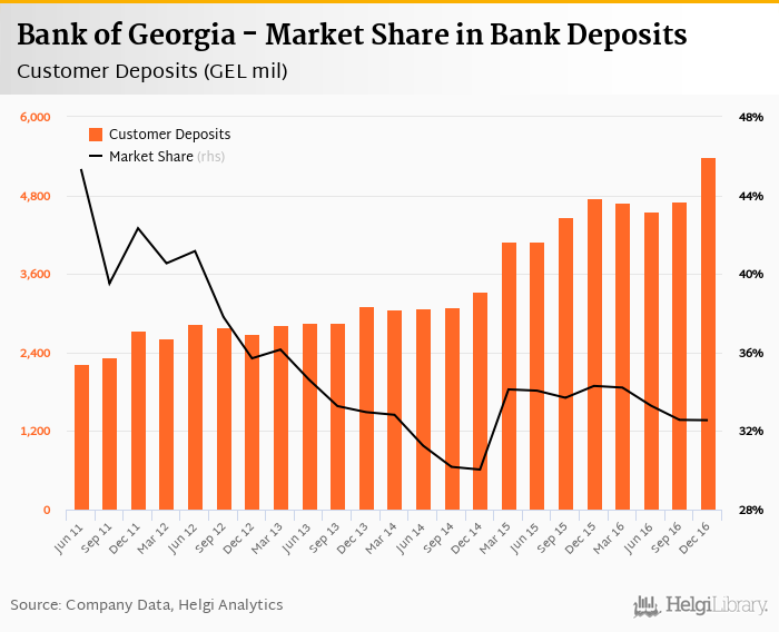 Bank of Georgia accounted for 32.6% of all customer deposits taken by banks in Georgia at the end of 2016-12-31. Historically, the bank’s market share in customer deposits reached an all time high of 45.3% in 2011-06-30 and an all time low of 30.0% in 2014-12-31.