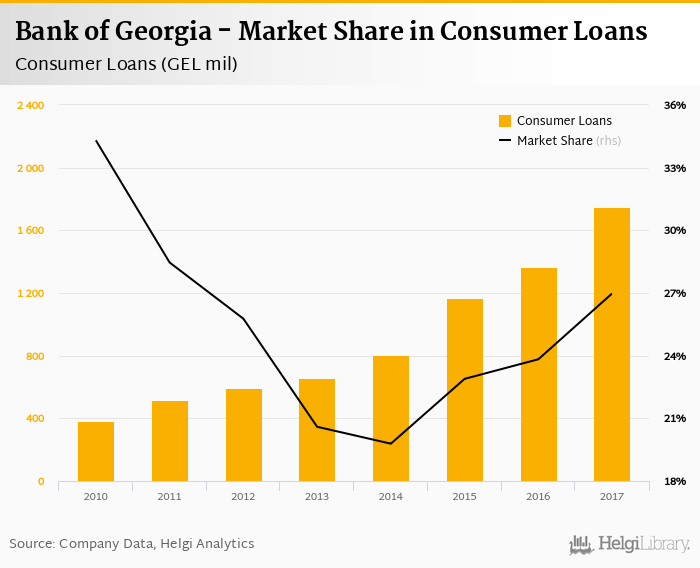 Bank of Georgia accounted for 27.0% of all consumer loans issued in Georgia at the end of 2017. Historically, the bank’s market share in consumer loans reached an all time high of 34.3% in 2010 and an all time low of 19.8% in 2014.