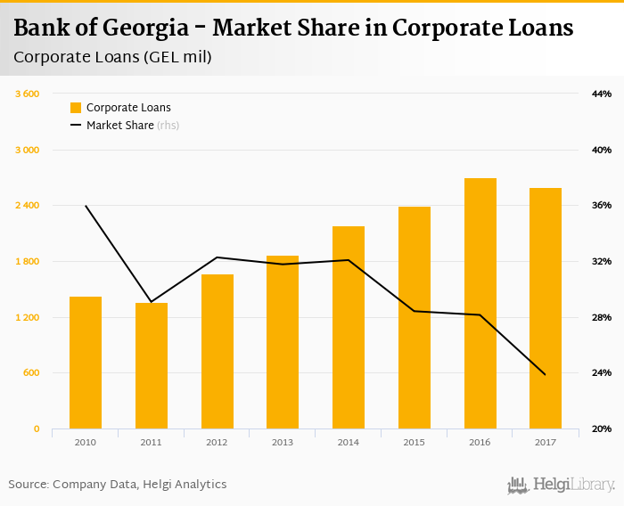 Bank of Georgia accounted for 23.8% of all corporate loans issued in Georgia at the end of 2017. Historically, the bank’s market share in corporate loans reached an all time high of 36.0% in 2010 and an all time low of 23.8% in 2017.