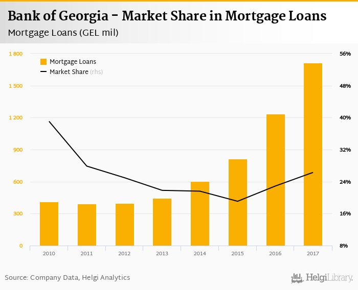 Bank of Georgia accounted for 26.3% of all mortgage loans issued in Georgia at the end of 2017. Historically, the bank’s market share in mortgage loans reached an all time high of 39.1% in 2010 and an all time low of 19.1% in 2015.