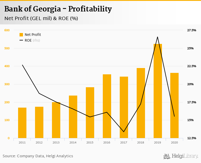 Bank of Georgia made a net profit of GEL 364 mil in 2020, down 30.7% compared to the previous year. This implies a return on equity of 15.5%.