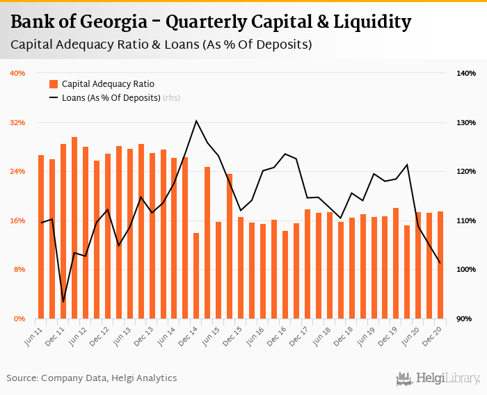 Bank of Georgia's capital adequacy ratio reached 17.6% at the end of fourth quarter of 2020, up from 17.3% when compared to the previous quarter. Historically, the bank’s capital ratio hit an all time high of 29.7% in 1Q2012 and an all time low of 14.1% in 4Q2014.