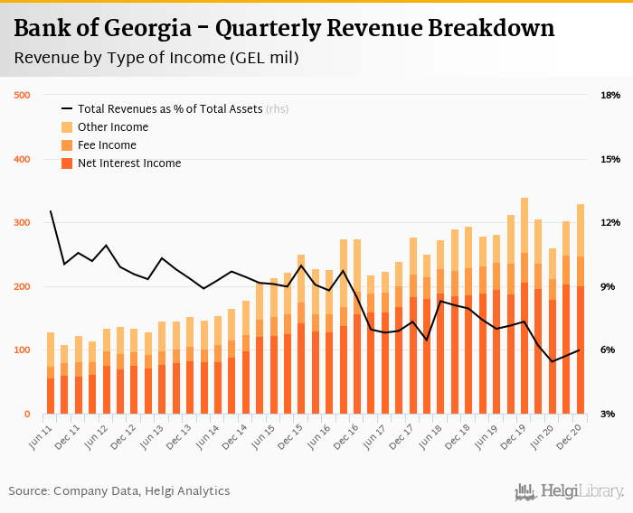 Bank of Georgia generated total banking revenues of GEL 330 mil in the fourth quarter of 2020, down 2.86% when compared to the same period of last year and up 9.15% when compared to the previous quarter.