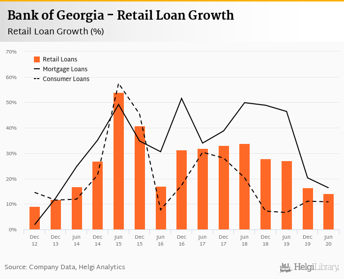 Mortgage loans fell 0% to GEL 3,289 mil in 2020-06-30 and accounted for 60.2% of the retail loan portfolio.