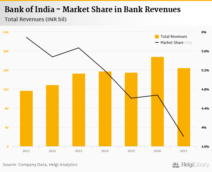Bank of India generated total banking revenues of INR 164 bil in 2017, down 12.6% compared to the previous year.