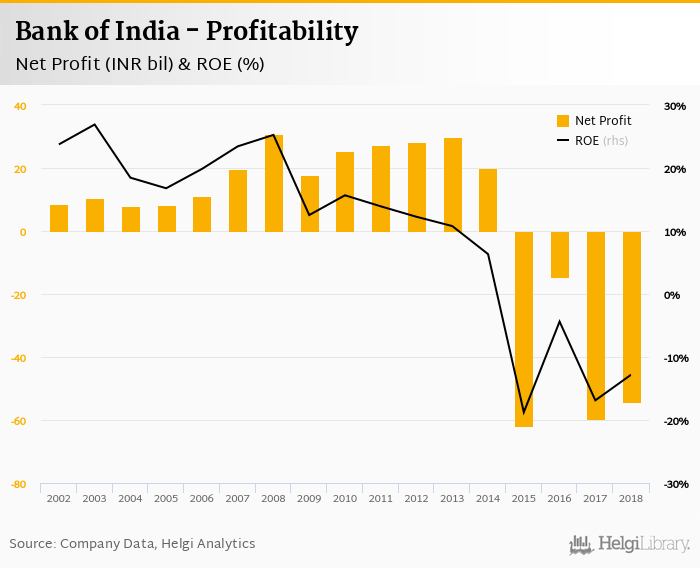 Bank of India made a net profit of INR -54.3 bil in 2018, up 8.97% compared to the previous year. This implies a return on equity of -12.8%.