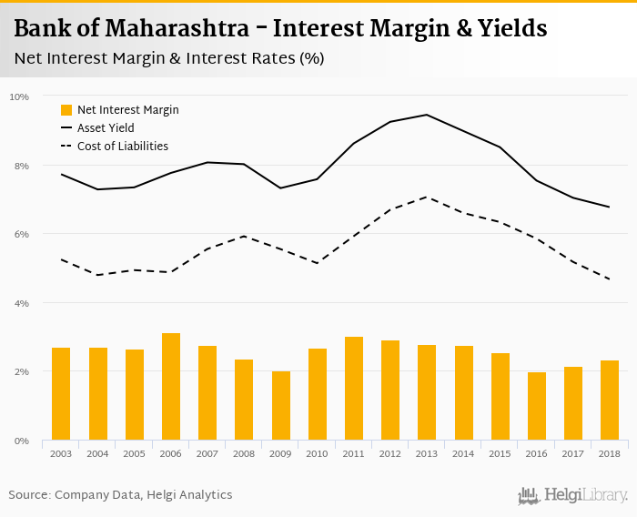 Bank of Maharashtra's net interest margin amounted to 2.33% in 2018, up from 2.15% compared to the previous year.