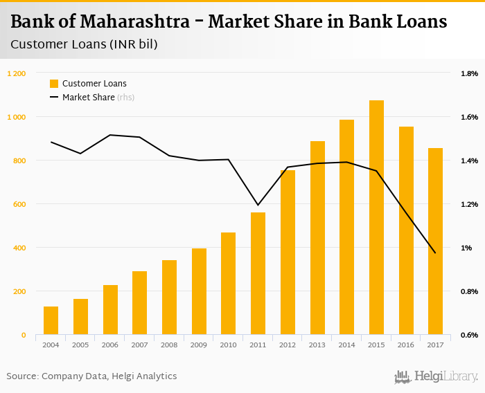 Bank of Maharashtra's customer loans reached INR 858 bil in 2017, down 10.2% compared to the previous year.