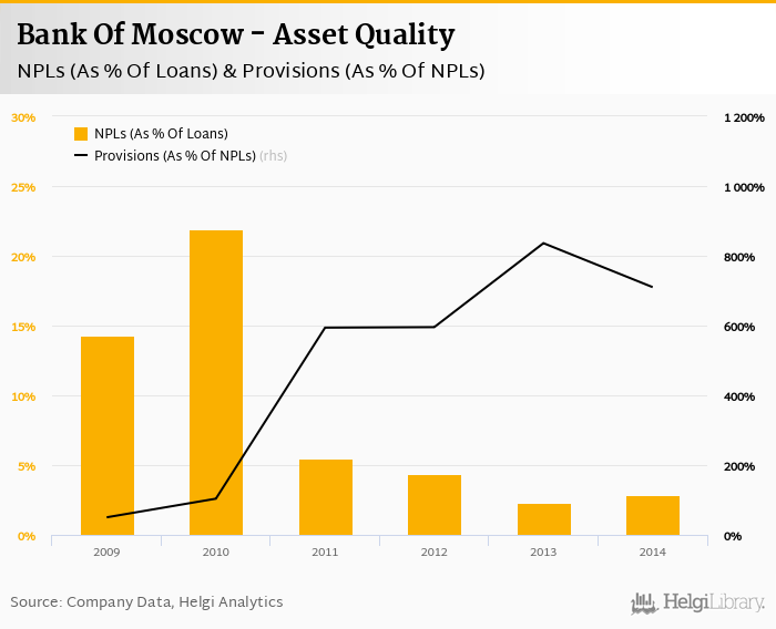 Comparing Bank Of Moscow with its closest peers, Sberbank operated at the end of 2014 with NPL ratio of 3.20% and provision coverage of 146%, VTB Bank with 5.77% and 116% respectively and Alfa Bank had 7.51% of bad loans covered with 77.7% by provisions at the end of 2014.