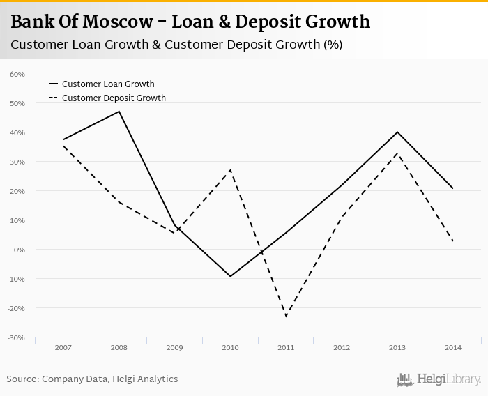 Bank Of Moscow's customer loan growth reached 20.6% in 2014, down from 39.9% compared to the previous year. Historically, the bank’s loans growth reached an all time high of 46.9% in 2008 and an all time low of -9.40% in 2010. In the last decade, the average annual loan growth amounted to 0%.