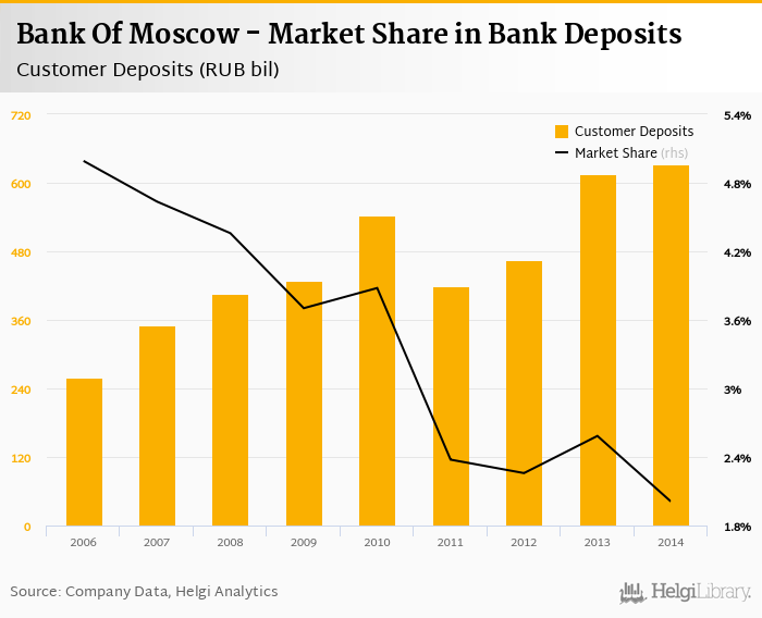 Bank Of Moscow accounted for 2.01% of all customer deposits taken by banks in Russia at the end of 2014. Historically, the bank’s market share in customer deposits reached an all time high of 4.99% in 2006 and an all time low of 2.01% in 2014.
