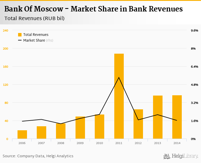 As a result, Bank Of Moscow accounted for 1.61% of all bank revenues generated by banks in Russia in 2014. Historically, the bank’s market share in total revenues reached an all time high of 5.41% in 2011 and an all time low of 1.32% in 2008.