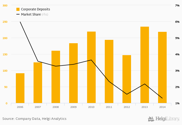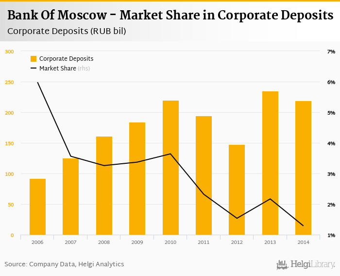 Bank Of Moscow's corporate deposits reached RUB 219 bil in 2014, down 6.89% compared to the previous year.