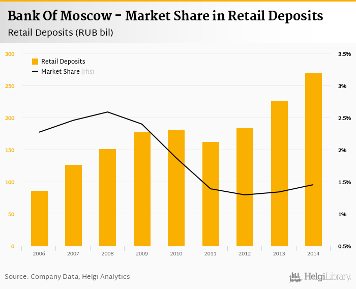 Bank Of Moscow accounted for 1.45% of all retail deposits taken by banks in Russia at the end of 2014. Historically, the bank’s market share in retail deposits reached an all time high of 2.59% in 2008 and an all time low of 1.29% in 2012.