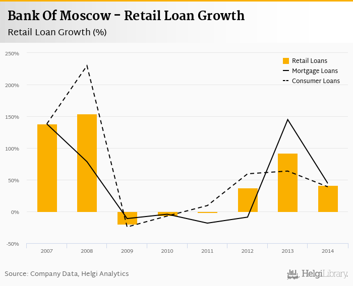 Bank Of Moscow's retail loans reached RUB 243 bil at the end of 2014, up 41.3% compared to the previous year. In the last decade, the average annual loan growth amounted to 0%.