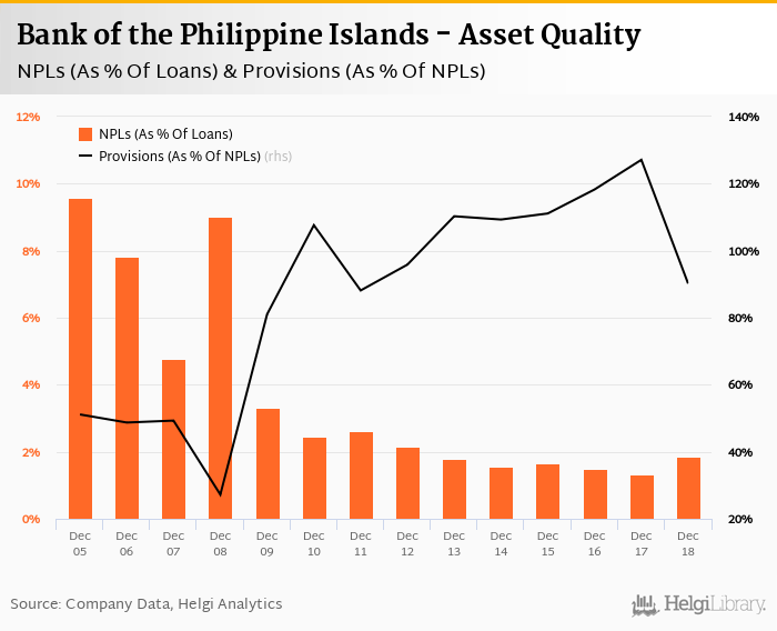 Bank of the Philippine Islands's non-performing loans reached 1.85% of total loans at the end of 2018-12-31, up from 1.34% compared to the previous year. Historically, the NPL ratio hit an all time high of 9.57% in 2005-12-31 and an all time low of 1.34% in 2017-12-31.