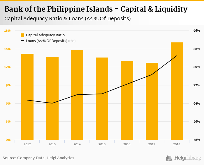 Bank of the Philippine Islands's capital adequacy ratio reached 16.1% at the end of 2018, up from 12.7% compared to the previous year. Historically, the bank’s capital ratio hit an all time high of 16.1% in 2018 and an all time low of 12.7% in 2017.