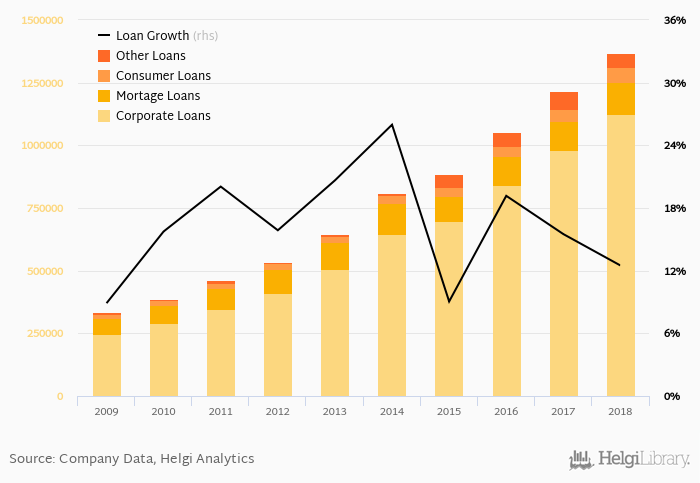 Mortgage loans represented 9.21% of the bank's loan book at the end of the year 2018, consumer further 4.44% and corporate loans 82.2% of total loans.