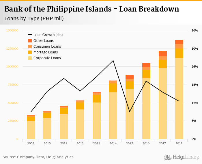Bank of the Philippine Islands's loans reached PHP 1,369,340 mil in the 2018, up from PHP 1,217,540 mil compared to the previous year. Historically, the bank’s loans reached an all time high of PHP 1,369,340 mil in 2018 and an all time low of PHP 334,817 mil in 2009.