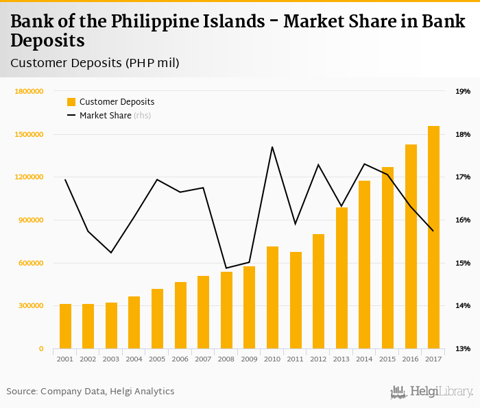 Bank of the Philippine Islands accounted for 15.7% of all customer deposits taken by banks in Philippines at the end of 2017. Historically, the bank’s market share in customer deposits reached an all time high of 17.7% in 2010 and an all time low of 14.9% in 2008.