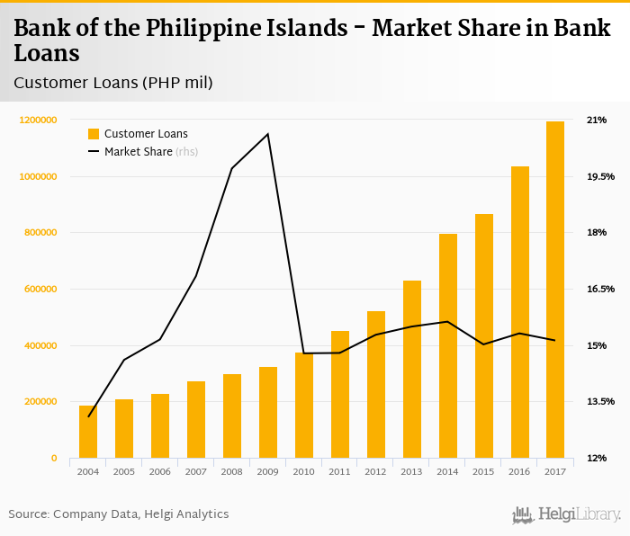 Bank of the Philippine Islands accounted for 15.1% of all customer loans issued in Philippines at the end of 2017. Historically, the bank’s market share in customer loans reached an all time high of 20.6% in 2009 and an all time low of 13.1% in 2004.