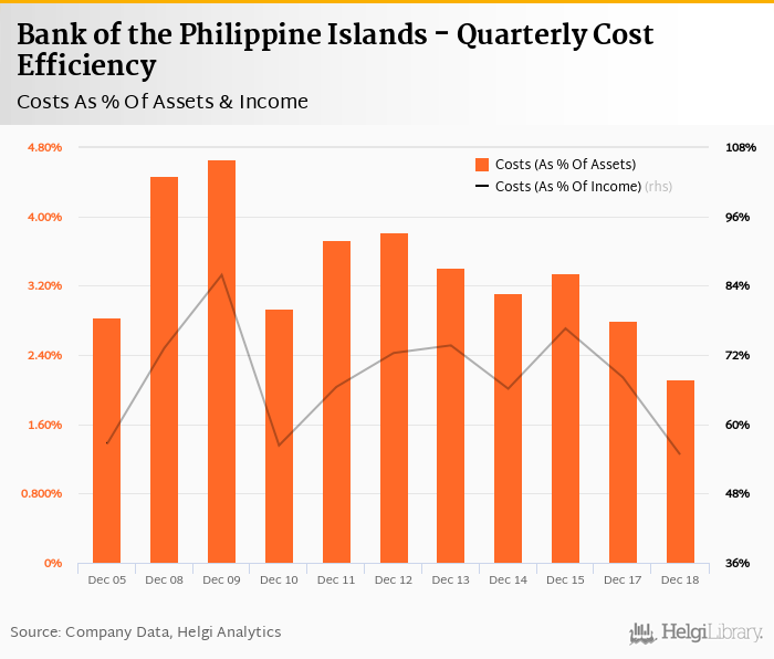 Bank of the Philippine Islands's cost to income ratio reached 54.8% in the fourth quarter of 2018, down from when compared to the previous quarter.