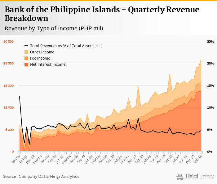 Bank of the Philippine Islands generated total banking revenues of PHP 25,100 mil in the third quarter of 2019, up 27.6% when compared to the same period of last year and 8.58% when compared to the previous quarter.