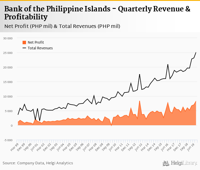 Bank of the Philippine Islands made a net profit of PHP 8,293 mil under revenues of PHP 25,100 mil in the third quarter of 2019, up 38.6% and 27.6% respectively when compared to the same period last year.