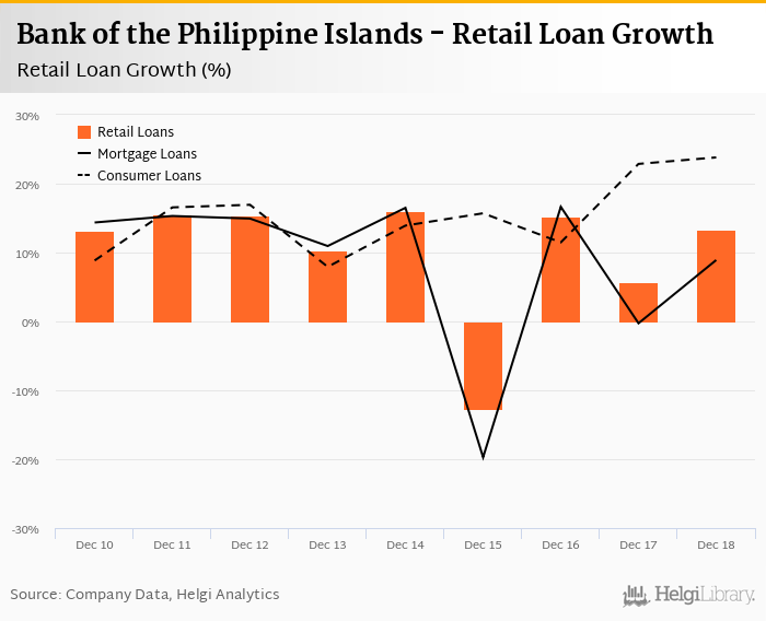 Bank of the Philippine Islands's retail loans reached PHP 186,931 mil at the end of 2018-12-31, down 0% compared to the previous year. In the last decade, the average annual loan growth amounted to 0%.